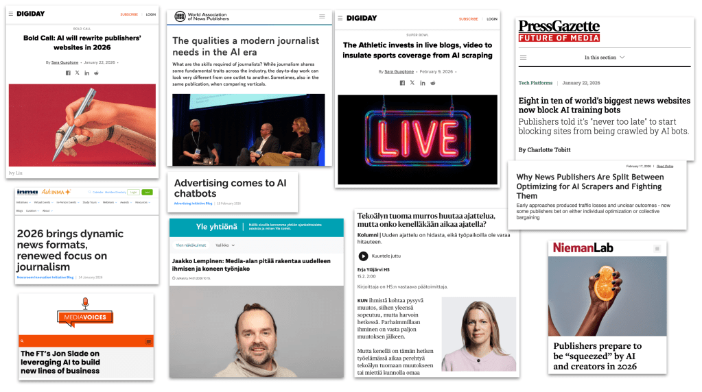 Aloitin viime vuonna blogisarjan, jossa summaan tasaisin väliajoin isoja kehityskulkuja niitä taustoittavine lähteineen blogikirjoituksiksi. Viime kesän 12 nostoa löytyvät täältä ja loppuvuoden 14 havaintoa täältä. Tähän kirjoitukseen olen koonnut toimintaympäristöhavaintoja tammi-helmikuulta 2026. Painotus on uutismediassa ja tekoälyssä.