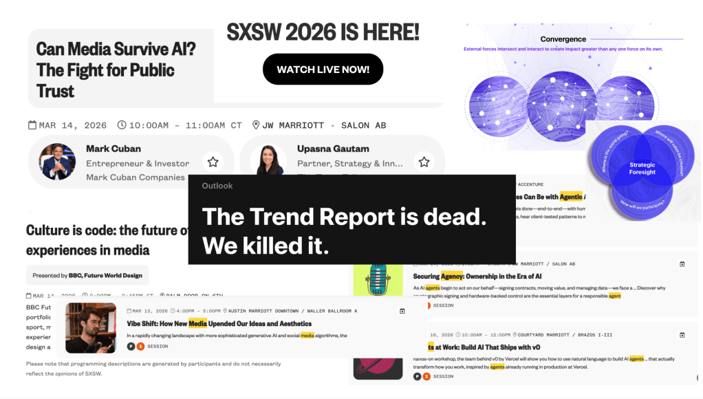 Mediaan liittyvää keskustelua ja havainnointia on SXSW:ssä kuitenkin paljon myös muualla kuin suoraan media-alaan dedikoiduissa tapahtumissa. Hyvänä esimerkkinä on amerikkalaisfuturisti Amy Webbin perinteinen tulevaisuuskatsaus, jonka hän julkaisee aina Austinissa. Tällä kertaa Webb oli paketoinut katsauksensa täysin uusiksi, ehkäpä myös siksi, että viime vuosina se ehti paisua yli 1000-sivuiseksi “tekkiraamatuksi”, jota ei lue kertaistumalta erkkikään. Uudistuneen raportin nimi on reilu 300-sivuinen Convergence Outlook 2026, ja se sisältää huomioita myös mediasta.
