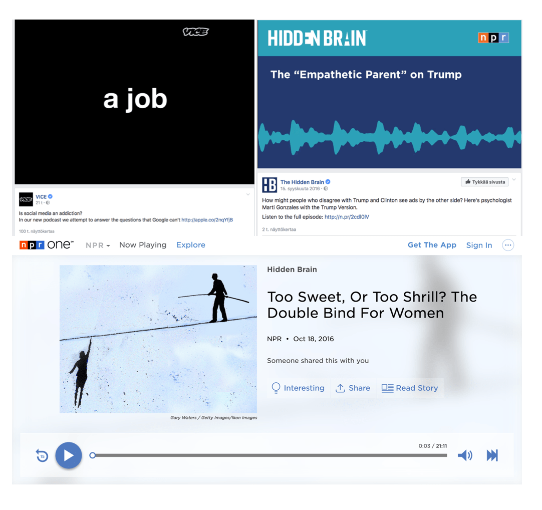 Esimerkiksi ”Minibuild” on NPR:n nettisivuilla oleva lyhyt juttu, johon on upotettu audio. FB:stä juttuun päätyneistä 16 prosenttia klikkasi audion päälle. Lähde