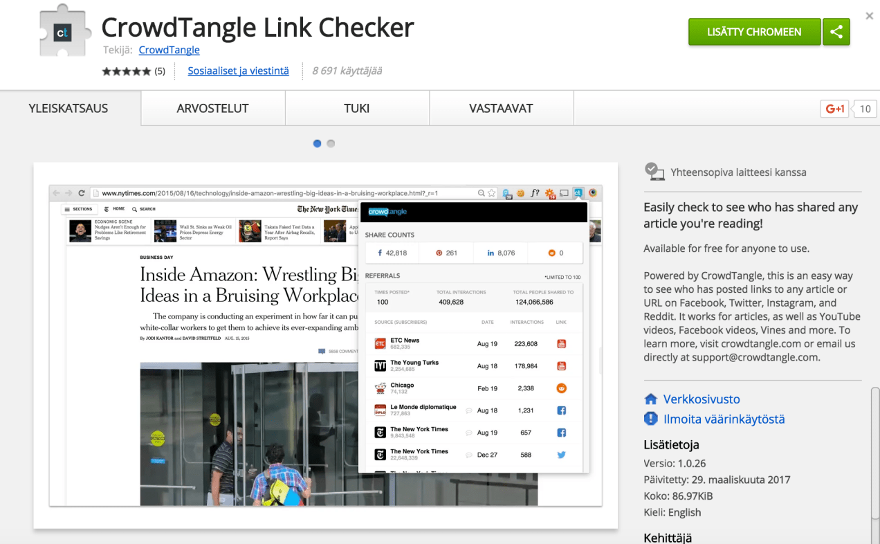 Seuraavassa pikakatsaus Facebookin omistaman CrowdTanglen Link Checker -lisäosaan, joka on ilmaiseksi ladattavissa Chrome-selaimiin. Lisäosan lataaminen ja käyttö ei edellytä CrowdTanglen selainpohjaisen analytiikkatyökalun käyttöä, joka sekin on ilmainen mutta vaatii kirjautumisen. Lisäosa hyödyntää varsinaisen työkalun tapaan vain somekanavien julkisia tietoja mihinkään kirjautumatta, joten ”vahinkojen” vaaraa ei ole.