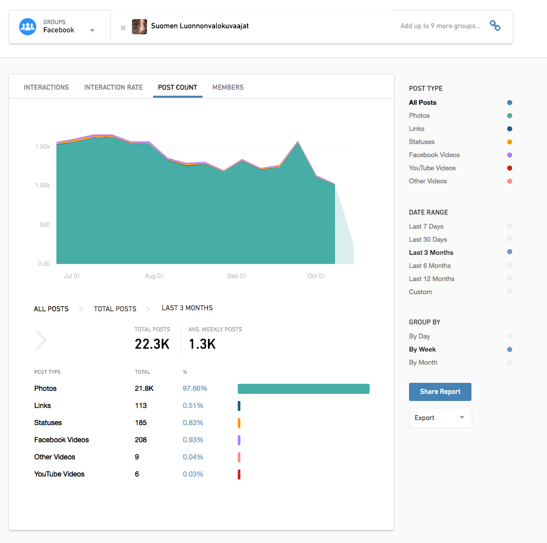 Alla näkyvässä esimerkissä tarkastelen Suomen luonnonvalokuvaajat -ryhmän tietoja. Käppyrä kertoo, että viimeisen kolmen kuukauden aikana lähes kaikki aktiviteetti ryhmässä on tullut valokuvapostauksiin – kuten olettaa sopiikin. FB-videoita ryhmässä on julkaistu kyseisellä aikavälillä reilut 200 kpl, valokuvia 21 800 (aikamoinen määrä – skeptinen kun olen, oikeassa elämässä tarkistaisin vielä suoraan ryhmän fiidistä, voiko julkaisumäärä olla peräti keskimäärin 1300 kpl viikossa, mutta menköön nyt tarkistamatta esimerkistä).
