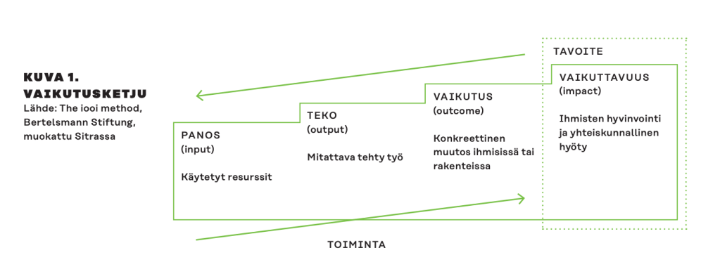 Suomessa vaikuttavuuden arviointia on nostanut esille muun muassa Sitra, jonka materiaaleja voi hyödyntää, jos tavoitteena on hahmottaa oman toiminnan vaikuttavuutta. Tärkeää on mielestäni mallintaa vaikuttavuutta tavalla, joka sopii juuri omalle organisaatiolle, joten tapoja voi olla muitakin. Erityisen tärkeänä pidän, että mallintaminen tehdään mahdollisimman ymmärrettävästi ja kansantajuisesti, koska kyse on hyvin abstraktista käsitteestä, joka jo pelkästään termin tasolla tulkitaan monin eri tavoin.