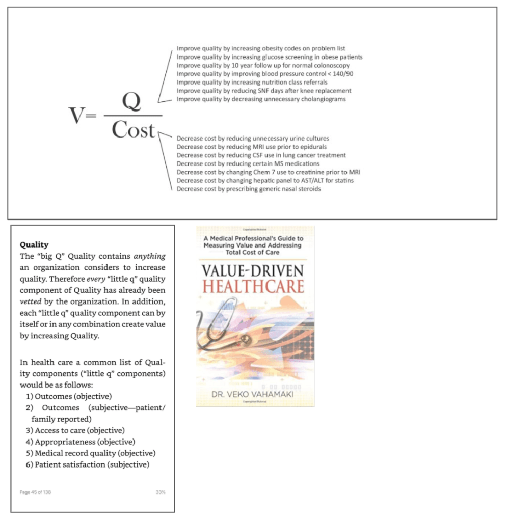 Kuvakaappaukset Veko Vähämäen kirjassa Value-Driven Healthcare esitetystä ”arvontuottokaavasta”, jonka laatuosiossa (Q) on haluttuihin vaikutuksiin (lyhyt aikaväli) ja vaikuttavuuteen (pitkä aikaväli) liittyviä elementtejä. Kirjasta lisää alempana tässä kirjoituksessa.
