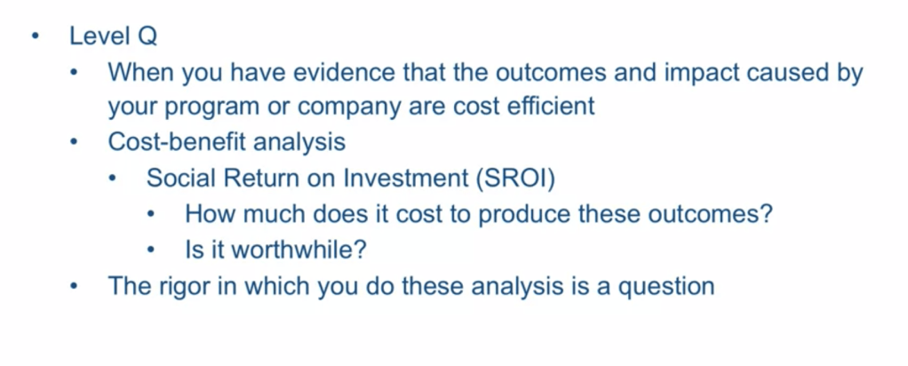 Näiden jälkeen on vielä taso ”Q”, jossa kyetään jopa laskemaan SROI, eli yhteiskunnalliseen vaikuttavuuteen sijoitetun pääoman tuotto. Suomeksi: kannattiko satsaus.