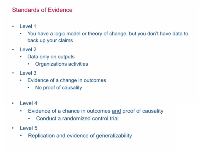 …ja tulokset jäsennetään viisportaisen asteikon mukaan, jossa tasolla yksi todisteet vaikuttavuudesta ovat vähäisimmät, käytännössä olemassa on vain vaikuttavuuden malli: