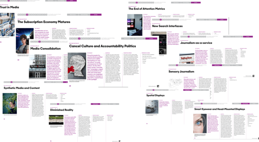 Tiivistän tähän kirjoitukseen vain raportin numero kolme (”New Realities”) ja siitäkin vain sen osan, joka käsittelee mediaa. Eli minkä asioiden ennakoidaan nousevan mediassa tämän vuoden aikana. Webb ei tarkoita, että kaikki trendit nousevat vuonna 2021 välttämättä valtavirtaan, vaan alleviivaa, että niihin olisi viimeistään nyt hyvä herätä. Raportissa on eriasteisia toimintakehotuksia kunkin trendin yhteydessä, kuten “seuraa tarkasti”, ”informoi strategiaa” tai “toimi nyt”.