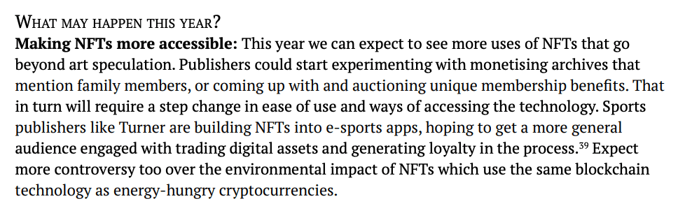 - Näin ennakoidaan: Keskustelu alustajättien sääntelystä ottaa uusia kierroksia alleen varsinkin Euroopassa. Samaan aikaan tekoäly, kryptovaluutat ja metaverse (käytännössä lisätty todellisuus eli AR tai virtuaalitodellisuus eli VR) luovat jo uusia uhkia – toki myös mahdollisuuksia. Metaversessa ja verkon hajautumiskehityksessä (lohkoketjun mahdollistamat NFT:t eli ”uniikit digitavarat”) voi muhia jo median seuraava disruptioaalto eli toimialan mullistus, mutta tämän selviämiseen kestää vuosia. Tämä näkyy myös epävarmoissa odotuksissa: raportin kyselyyn vastanneista harva kertoi, että heidän edustamansa media satsaisi jo tänä vuonna esimerkiksi metaverse-sovelluksiin aiempaa enemmän.