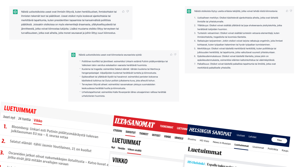 ChatGPT: Nämä asiat yhdistävät Helsingin Sanomien, Ilta-Sanomien ja Iltalehden suosituimpia uutisotsikoita