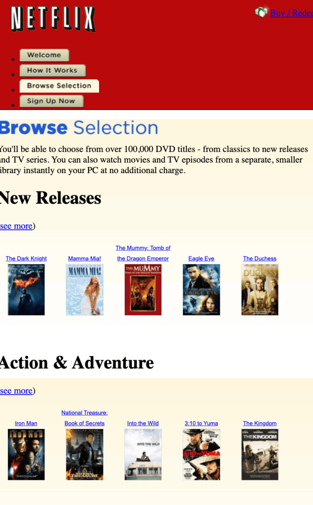 Netflixin (Netflix.com) ”Selaa valikoimaa”-valikkonäkymä vuonna 2008: