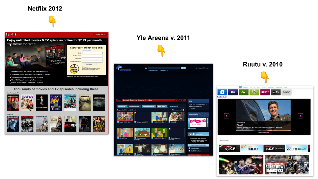 Netflixhän perustettiin jo 1997 dvd-bisnekseen – sen suoratoistopalvelu v. 2007. Samoihin aikoihin osuvat myös Yle Areenan ja Ruudun lanseeraukset.