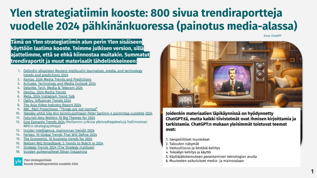 Luimme Ylen strategiatiimissä puolestasi 800 sivua trendiraportteja vuodelle 2024 ja tiivistimme ne muutamaankymmeneen slaidiin. Teimme koosteen alun perin Ylen sisäiseen käyttöön mutta ajattelimme, että saattaisi kiinnostaa muitakin, joten siksi myös tämä julkinen blogipostaukseni aiheesta.
