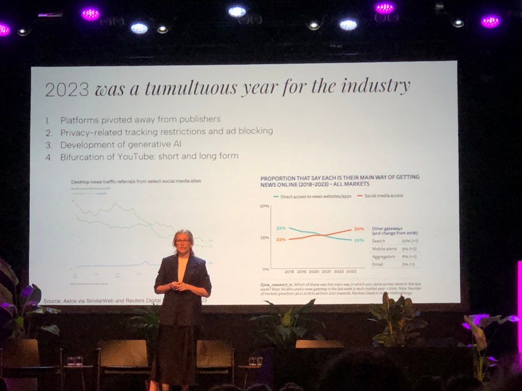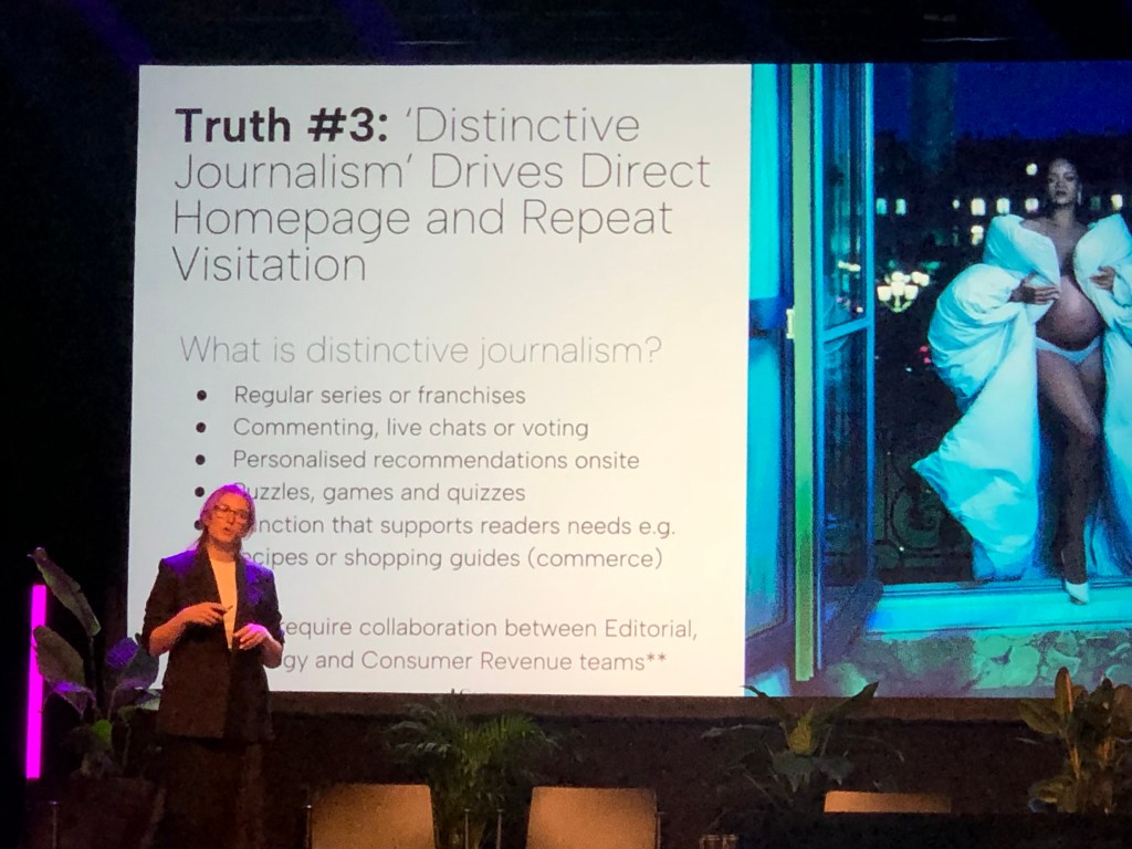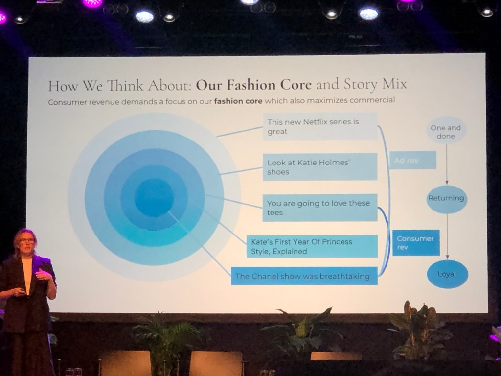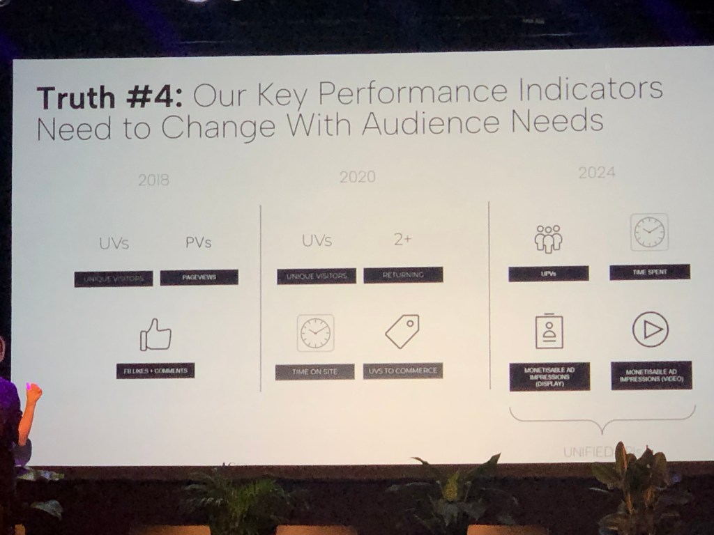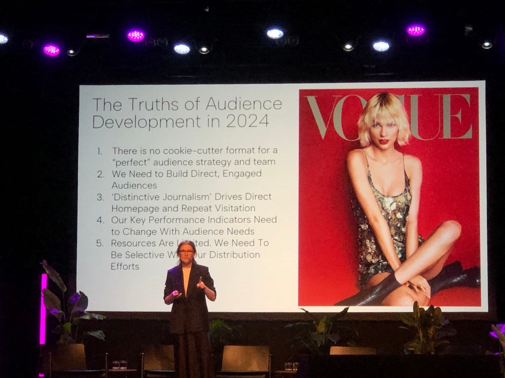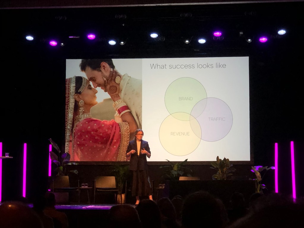 1. Yhdysvaltalaisen Conde Nast -aikakauslehtiyhtiön (mm. Vogue) analytiikkapomo Jenna Rak kertoi yhtiön muutoksesta printtitalosta kohti ei vain digiä, vaan erilaisten kehityskulkujen huomioimista digin sisällä. Kolmen pallon kuva – brand, revenue, traffic – jäi mieleen (kuvakarusellin kuva 1). ”Ideaalitilanteessa teemme asiat niin, että kaikki kolme noista palloista toteutuu. Todellisuudessa noista toteutuu kuitenkin yleensä kaksi. Jos vain yksi toteutuu, emme tee sitä”, Rak totesi. Mieleen jäi Rakin myös näyttämä kuva (kuvakarusellin kuva 7) yhtiön ydinmittareiden evoluutiosta vuodesta 2018 tähän päivään: toisin kuin aiemmin, vuonna 2024 seurataan esimerkiksi upv:tä eli unique page view’tä: siis sivulatauksia, joista on poistettu laitteiden tai selainten päällekkäisyys, millä on yhteys mainospotentiaaliin.