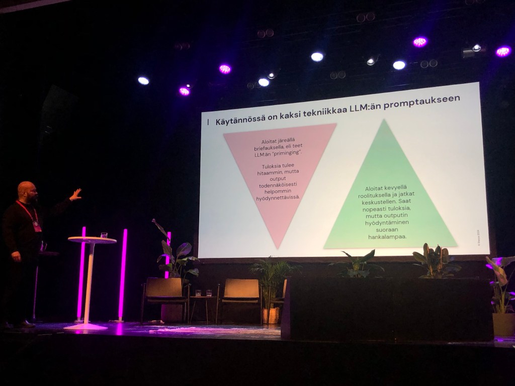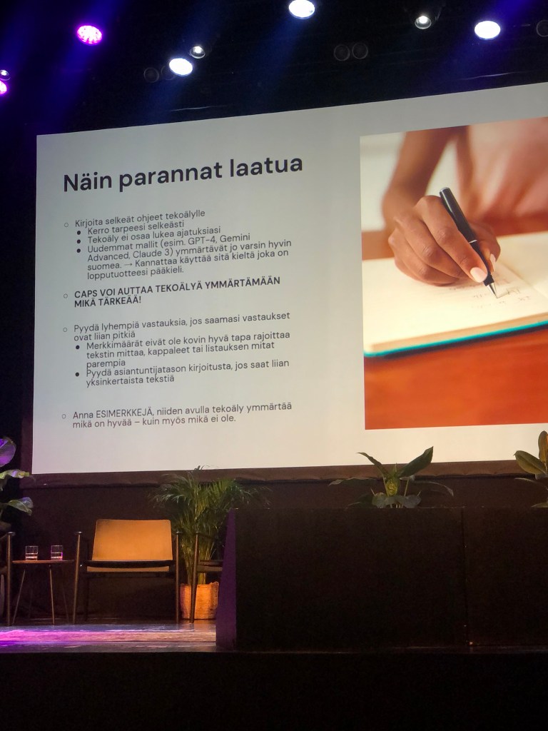 3. Tekoäly työkaluna: käytännön vinkkejä -puheenvuoro Jukka Niittymaalta, joka on Sherpan tekoäly- ja innovaatiojohtaja. Olen nähnyt Niittymaan esityksiä ennenkin ja pidän pragmaattisuuden ja kauemmas katsomisen sopivasta yhdistelystä. Ne vinkit? Niittymaa vinkkasi Poe-tekoälysovelluksesta (löytyy myös puhelimeen), jonka kautta pystyy käytännössä käyttämään ChatGPT:n lisäksi esimerkiksi suomea erinomaisesti tuottavaa Claudea, joka normaalisti olisi Suomessa VPN-yhteyden takana. Minulla meni saman tien vaihtoon kk-maksullinen ChatGPT, jonka hinta, noin 20 euroa kuussa, on sama kuin Poen, joka vaikuttaa hyödyllisemmältä. Toinen vinkki, sinänsä pieni, liittyy promptaamiseen: CAPS LOCK eli tiettyjen sanojen kirjoittaminen isoilla kirjaimilla voi auttaa tekoälyä ymmärtämään promptatessa, mikä on tärkeää. Tätä en ollut tiennyt.