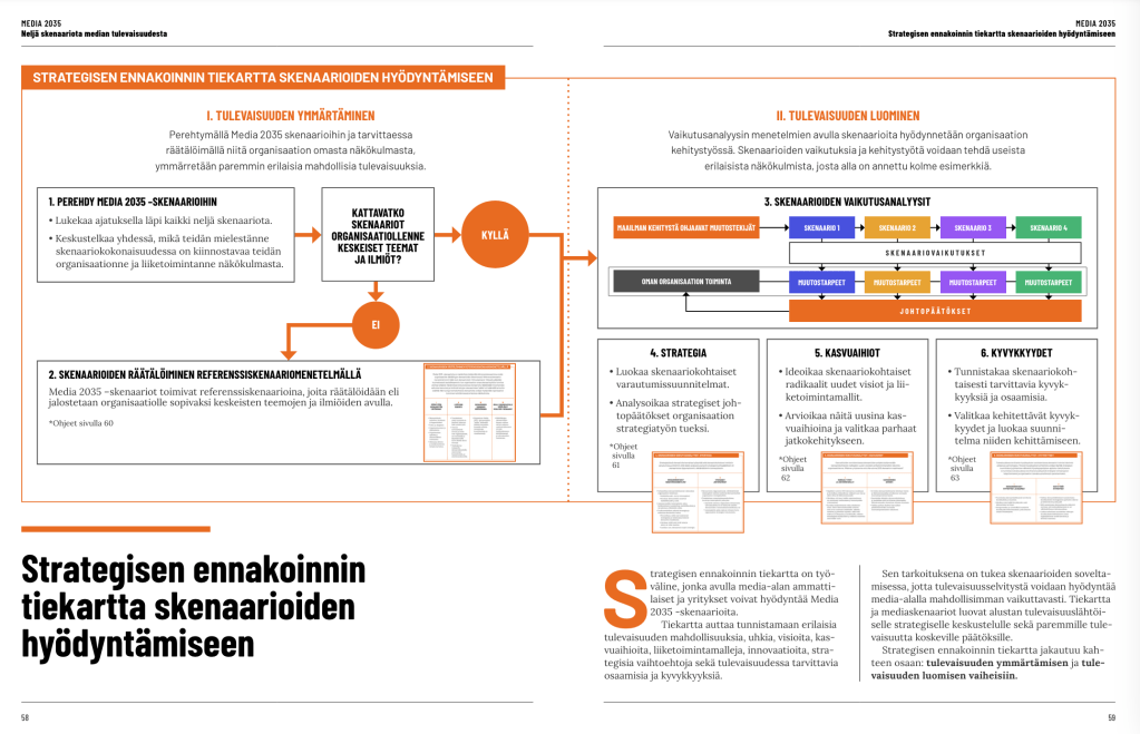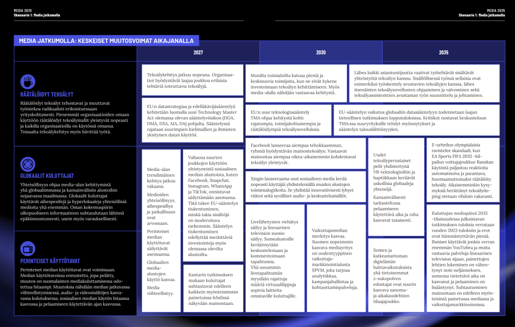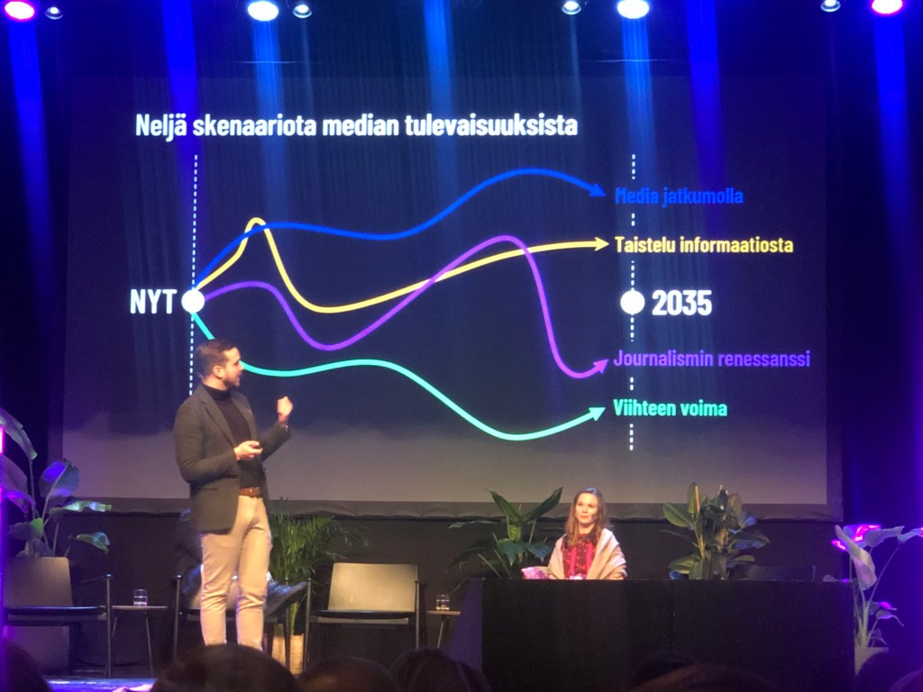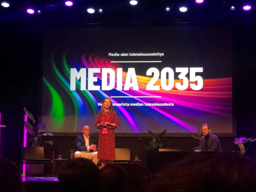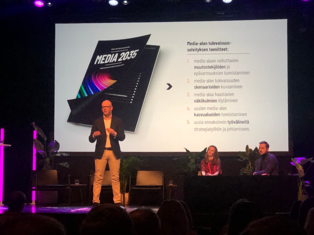 4. Media 2035 -skenaariot. Tapahtumassa julkistettiin skenaariopaketti media-alan mahdollisista tulevaisuuksista vuonna 2035. Ne löytyvät täältä. Skenaarioiden lopputuotos on skenaariotyölle melko perinteinen eli neljä tiiviisti nimettyä tulevaisuuskuvaa, joita ei ajatella sellaisinaan toteutuvina tulevaisuuksina, vaan limittyvinä tavoilla, joita emme täysin vielä tiedä. Media 2035 -skenaariot ovat nimeltään Media jatkumolla, Taistelu informaatiosta, Journalismin renessanssi ja Viihteen voima. Tulevaisuusselvitystä on tarkoitus käyttää mediayrityksissä edistämään strategista ajattelua, tunnistamaan uusia kasvualueita ja kehittämään osaamista.