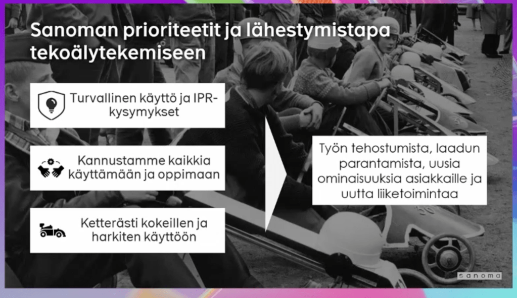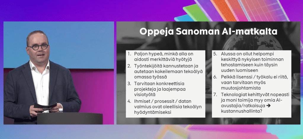 Muun muassa näin luonnehti Sanoma Media Finlandin Chief AI Officer Pauli Tölli mediayhtiön lähestymistapaa tekoälyyn Microsoft AI Tour Helsinki -tilaisuuden julkisesti striimatussa osuudessa.