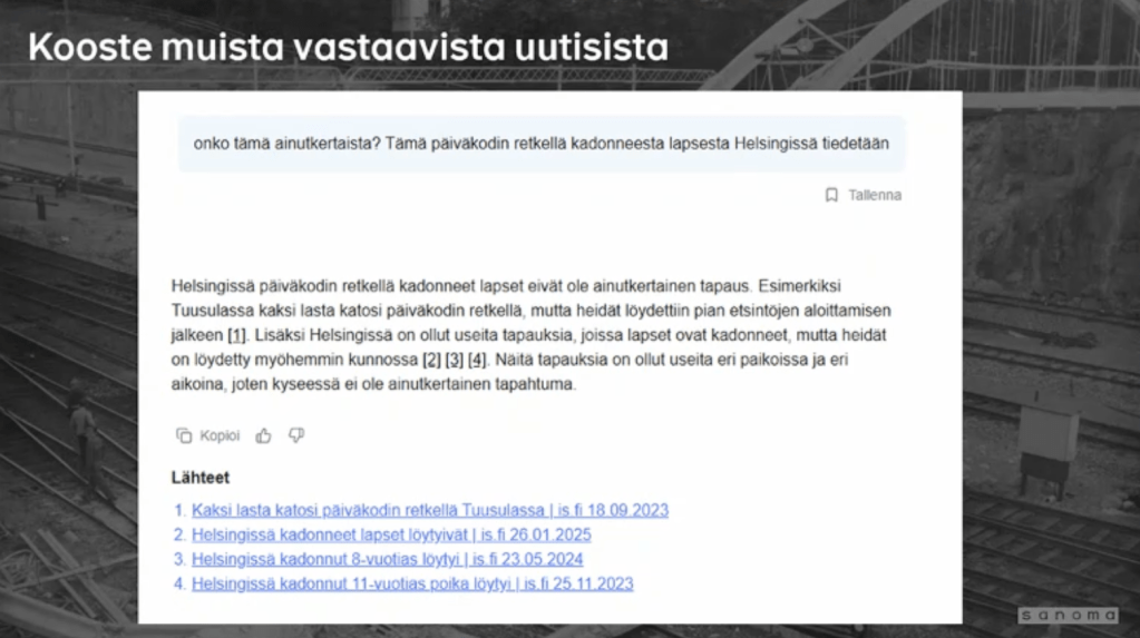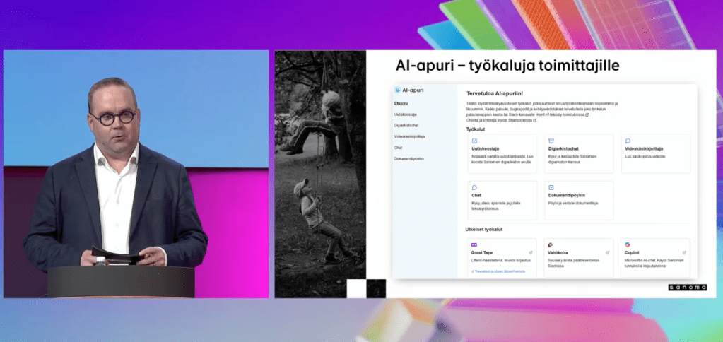 Toimituksellisten työkalujen osalta peruslogiikka noudattelee muidenkin mediatalojen tapaa toimia, eli että ne löytyvät yhdestä paikasta. Sanomilla työkalunäkymästä löytyy myös linkit Microsoftin Copilotiin ja Good Tapen äänenlitterointipalveluun. Copilot-kokeiluista Tölli totesi, että niitä on tarvittaessa helppo ja nopea laajentaa.