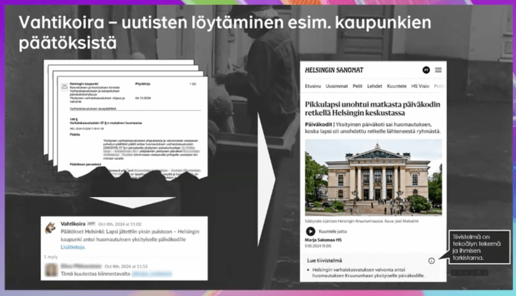 Tölli kävi läpi esimerkkejä Sanoman sisäisistä tekoälytyökaluista (mm. Digiarkistochat, Uutiskoostaja, Videokäsikirjoittaja, Dokumenttipöyhin sekä kunnallispäätöksiä haravoiva ja niiden uutisarvoa arvioiva Vahtikoira) sekä kuluttajatuotteista. Kuvat löytyvät yllä olevasta kuvakarusellista (kolme viimeistä kertovat Sanoma Median yleisestä lähestymistavasta tekoälyyn, sekä viime vuosien opeista).