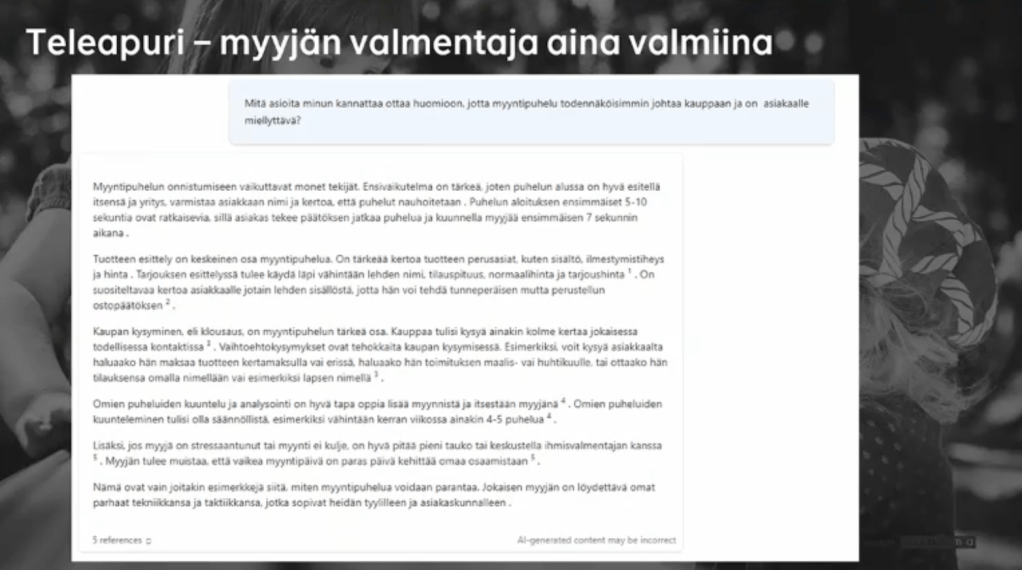 – Aina tekoälytoteutus ei vaadi isoa IT-projektia, hän huomautti. Tölli nosti esimerkiksi “pienellä teknisellä työllä” toteutetun myyntityössä auttavan Teleapurin, joka pohjautuu viiteen sille syötettyyn ohjedokumenttiin.