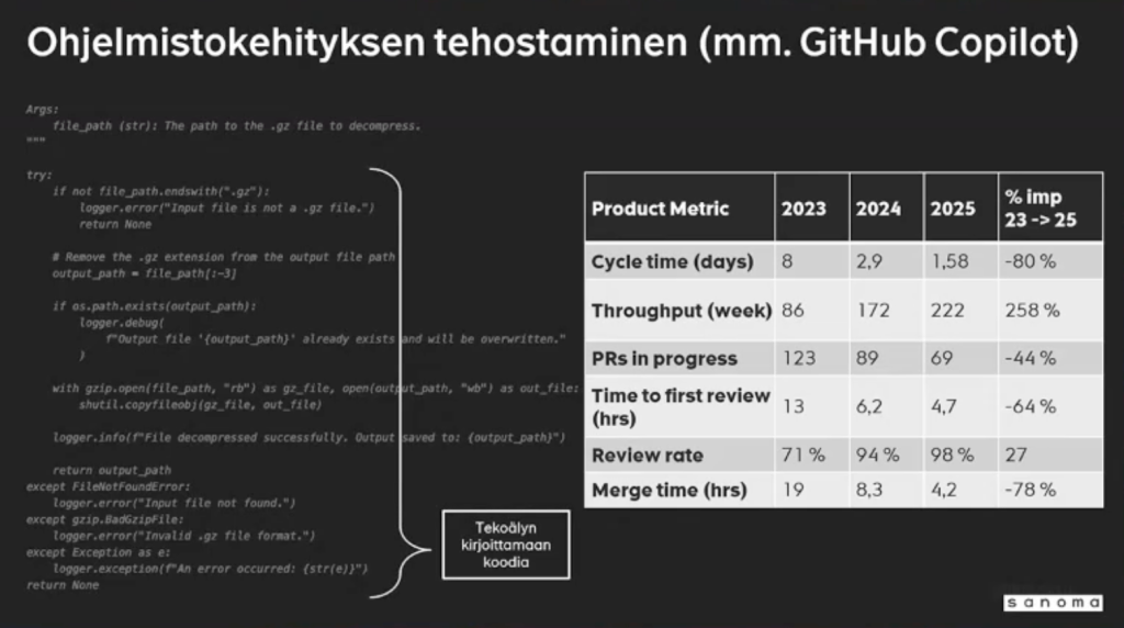 Kehittäjien osalta Tölli totesi, että pari vuotta sitten käyttöön otettu Github Copilot -ohjelmointityökalu mm. tiimeille, jotka kehittävät HS:n ja IS:n verkkopalveluita, on johtanut siihen, että asioita saadaan tehtyä entistä enemmän, nopeammin ja vähemmän kerrallaan.