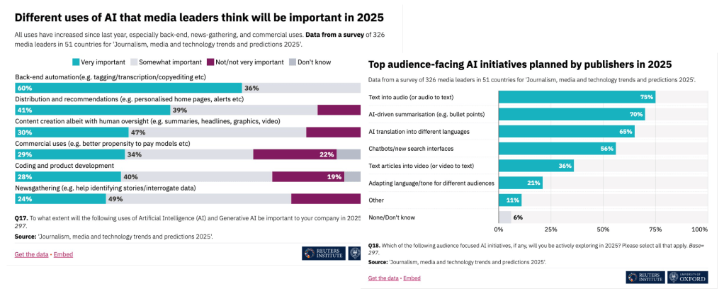 The big picture is outlined in a Reuters Institute survey from January. Two key visuals from the report reveal both what’s happening under the hood and what’s visible to the public.