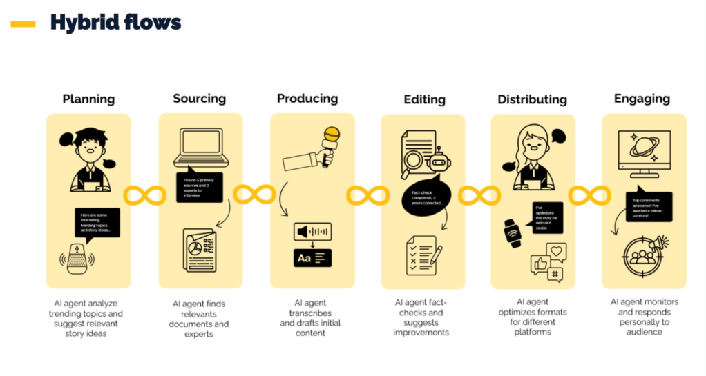 Eeman’s visual model on the potential of AI agents in media similarly captures the essence of what’s happening, for example, in the aforementioned Danish case: