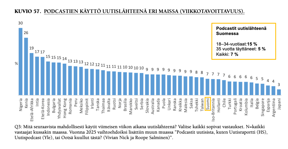 Seitsemän prosenttia suomalaisista kertoo käyttävänsä podcasteja uutislähteenä. 18-34-vuotiaissa osuus on 15 prosenttia. Kysyttäessä yleisimmin mainittiin Ylen ja Helsingin Sanomien podcasteja. Tutkimuksen mukaan Yle Areena on yleisimmin käytetty uutispodcastien julkaisualusta Suomessa Youtuben ja Spotifyn jälkeen.