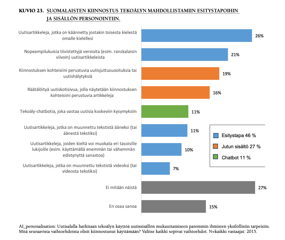 Tutkimuksessa kartoitettiin myös suomalaisten näkemystä erilaisiin tekoälyn mahdollistamiin esitystapoihin uutispalvelussa: