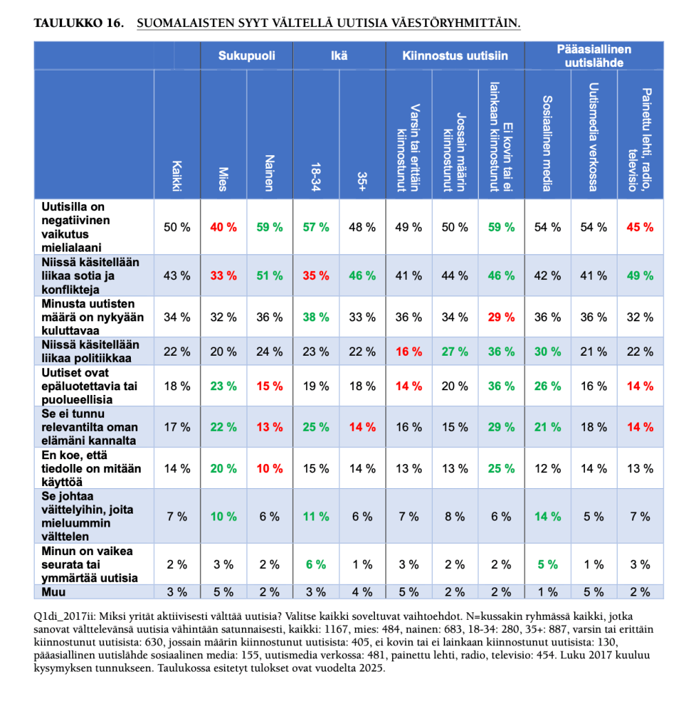 Aallonpohja saavutettu? Suomessa vähintään toisinaan välttelevien osuus kasvoi vuodesta 2023 vuoteen 2024 peräti viisi prosenttiyksikköä, mutta vuodesta 2024 vuoteen 2025 vain yhden prosenttiyksikön. Lähes joka kolmas suomalainen välttelee uutisia vähintään toisinaan.
