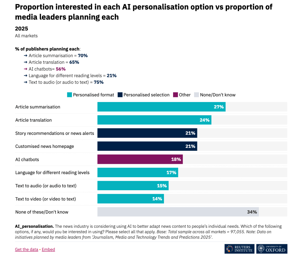 Tämä kansainvälisen raportin kuva tiivistää, millaisia tekoälyn mahdollistamia esitystapoja käyttäjät kysyttäessä suosivat ja toisaalta, mitä mediatalot itse suunnittelevat tekevänsä:
