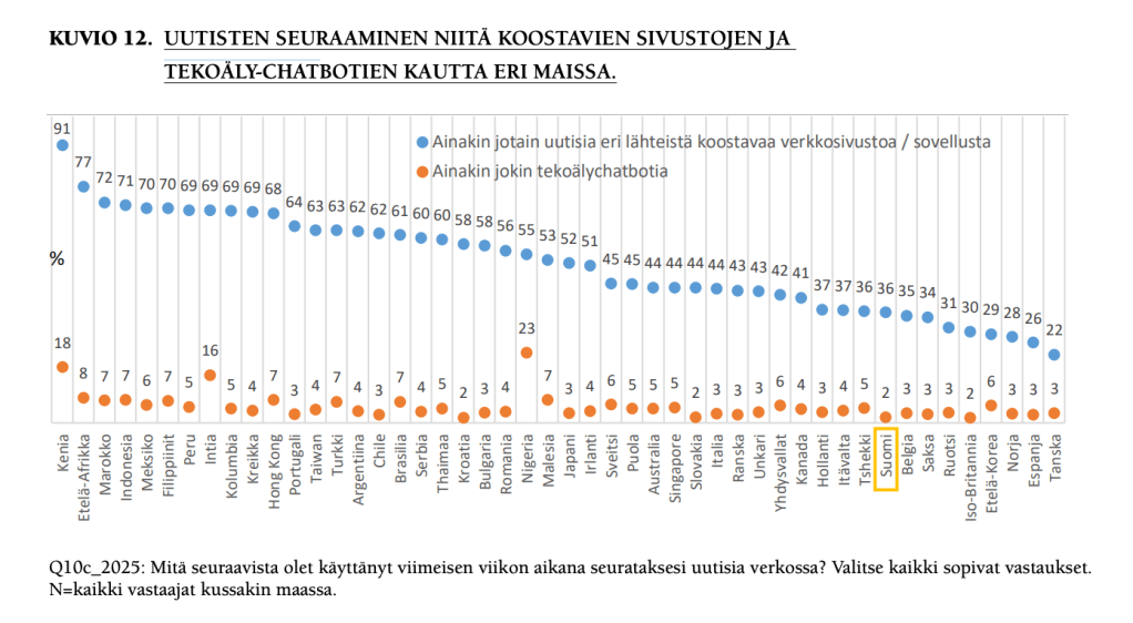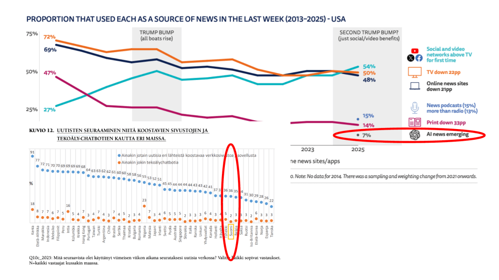 Suomessa luku on vielä alhaisempi, 2-3 prosenttia (lue täältä Uutismedia verkossa 2025:n eli Suomen-maaraportin koosteeni).