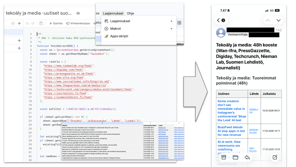 Se hyödyntää Google Sheets -taulukkolaskentaohjelmaa sekä Google Apps Scriptiä. Apps Script on pilvipohjainen JavaScript-alusta (JavaScript on ohjelmointikieli), jolla voi automatisoida tehtäviä, luoda omia työkaluja ja yhdistää Googlen eri palveluita toisiinsa. Se on ilmainen eli kuuluu tavalliseen Google-tiliin ja etuna on, että siinä kirjoitetaan ja ajetaan koodia suoraan selaimessa. JavaScript-koodia sinun ei tarvitse osata riviäkään, vaan voit pyytää sellaista tekoälyltä (kannattaa kuitenkin pyrkiä varmistamaan tekoälyn kanssa keskustellessa, että toimit fiksusti ja tietoturvallisesti. Varmista kaverilta, jos pohdituttaa).