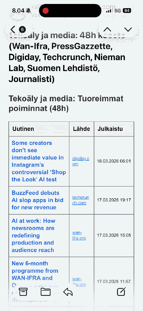Olet ehkä huomannut, että erilaisten uutiskoosteiden pyytäminen tekoälypalveluilta suoraan ei aina johda laadullisesti kummoisiin lopputuloksiin (vaikka esimerkiksi ChatGPT:n agenttitila & ajastus -kombo on tässä parhaimmillaan hyödyllinen). Lopputulos tuppaa horjumaan etenkin silloin, jos halutaan seurata juuri tiettyjä lähteitä juuri tietyin väliajoin juuri tietyllä tavalla.
