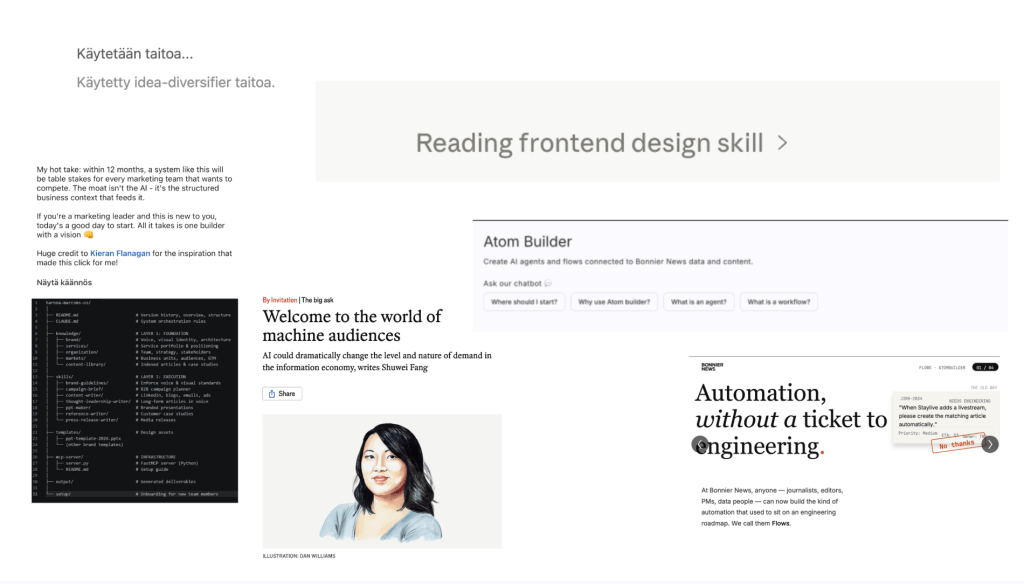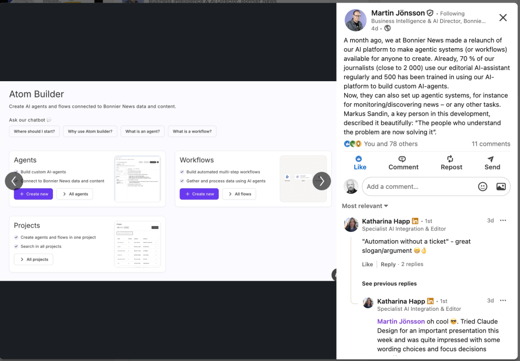 Kun tähän vielä yhdistää mahdollisuuden kytkeä automaatio mutkattomasti mediatalon omiin järjestelmiin, kuten julkaisujärjestelmään, analytiikkaan tai vaikkapa arkistoon, alkaa syntyä toden teolla uutta. Pohjoismaissa näkyvin esimerkki on Bonnier Newsiltä. Se kertoi hiljattain uudistaneensa tekoälyalustansa, joka mahdollistaa agenttipohjaisten järjestelmien ja työnkulkujen luomisen kaikille työntekijöille. Lähes 2 000 toimittajaa käyttää toimituksellista avustajaa, ja 500 on koulutettu rakentamaan räätälöityjä tekoälyagentteja esimerkiksi uutisseurantaan.
