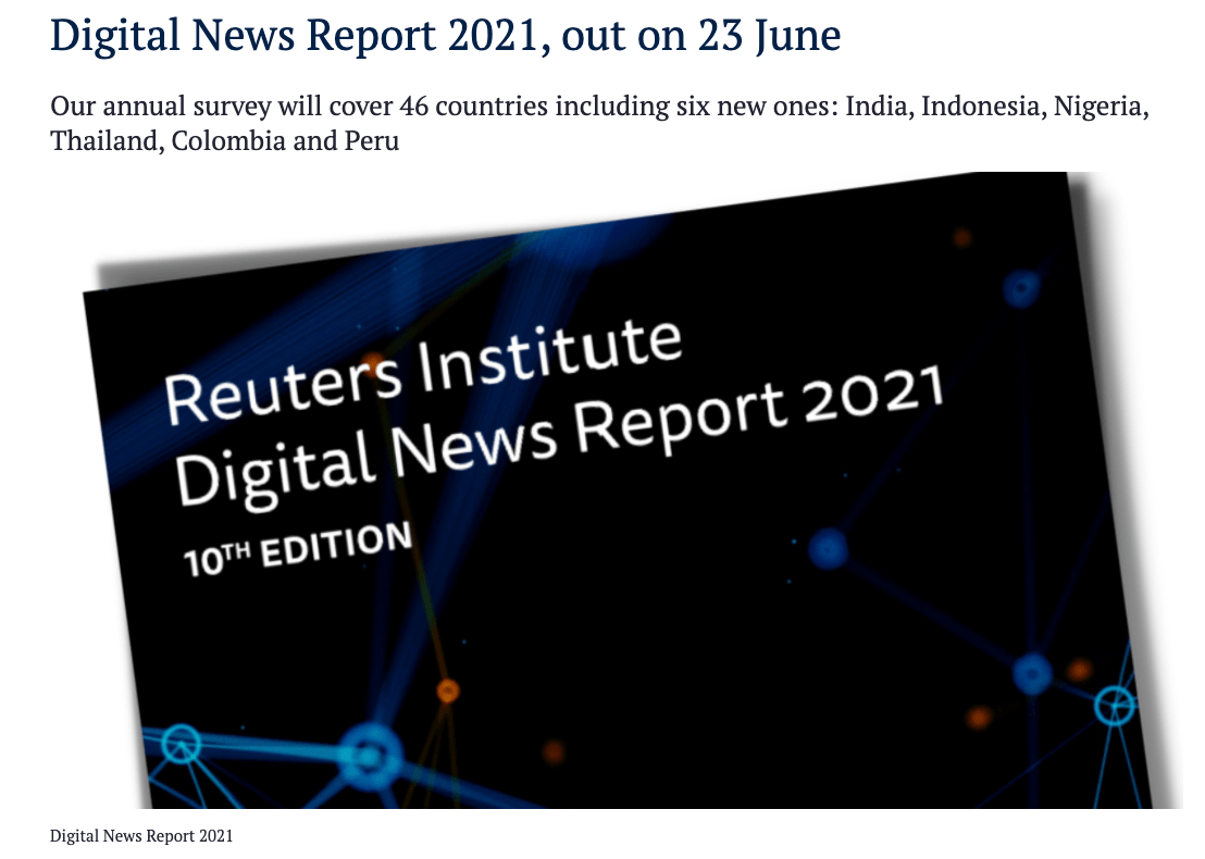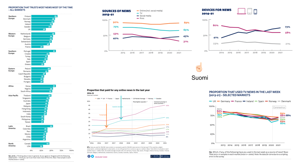 Asema uutisluottamuksen kärkimaana vahvistui reippaasti, maksuttomat uutismediat lisäsivät tavoittavuuttaan, Facebook piti pintansa uutiskäytöltään suosituimpana somena, uutiskäyttö älypuhelimella nousi edelleen, uutisnotifikaateista ei tullut massatuotetta, uutisista maksavien osuus jatkoi nousu-uralla, keskustelu uutisista tai niiden jakaminen somessa laski merkittävästi. Tässä poimintoja uunituoreen maailman suurimman uutistutkimuksen Suomen-maaraportista. Oxfordin yliopiston Reuters-instituutin Digital News Report 2021 julkaistiin tänään. Erityisen kiinnostavia tuloksista tekee koronapandemian vaikutus.