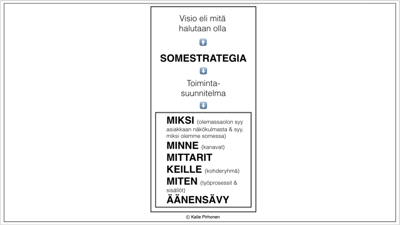 Tämä kuva on ollut oma tapani hahmottaa somestrategia – mukana on paljon matkan varrelta itse opittua ja hieman muiltakin oivallettua. Tämä ei ole ainoa oikea tapa, kyse on myös makuasioista ja semantiikastakin (olemassa olon syy vai asiakaslupaus/palvelulupaus jne).